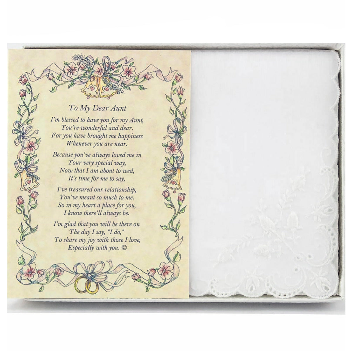 A beautiful and delicate wedding handkerchief, gracefully presented in a gift box, along with a printed verse written especially for this occasion. Express your heartfelt sentiments with this loving and thoughtful gift your loved one will treasure always. The poem card reads: I'm blessed to have you for my Aunt, You're wonderful and dear, For you have brought me happiness Whenever you are near. Because you've always loved me in Your very special way, Now that I am about to wed, It's time for me to say, I've treasured our relationship, You've meant so much to me. So in my heart a place for you, I know there'll always be. I'm glad that you will be there on The day I say "I do." To share my joy with those I love, Especially with you.