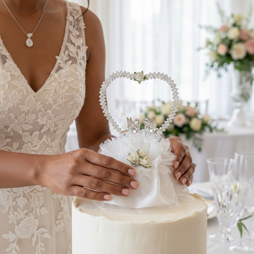 This enchanting wedding cake top showcases a faux pearl heart with a pair of artisan made blown glass love birds accented with 24K gold nesting in vintage style off white paper roses with artisan made glass heart and wedding bells. Skirt is made of organza.