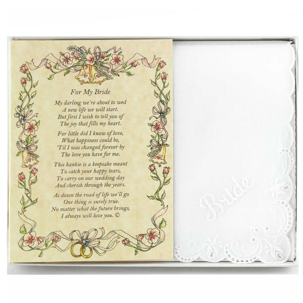 Each Wedding Handkerchief is elegantly embroidered with a rose design or "Mother", "Grandma", "Daughter", "Sister", or "Bride." Men's hankerchiefs are plain, but can be embroidered as well. Each poem expresses gratitude and love for those who have stood up in support of your very special day. Hankie makes a heartfelt, keepsake gift for parents, relatives, friends, and your wedding party.